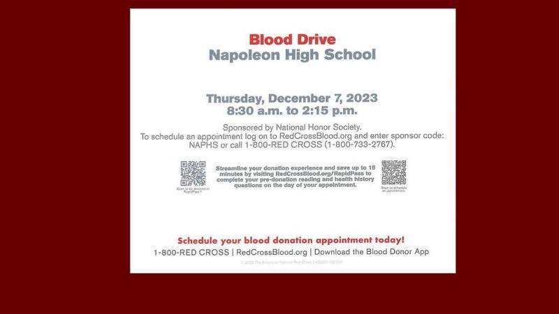 Sponsored by National Honor Society. To schedule an appointment log on to RedCrossBlood.org and enter sponsor code: NAPHS or call 1-800-REDCROSS (1-800-733-2767). Schedule YOUR blood donation appointment today!